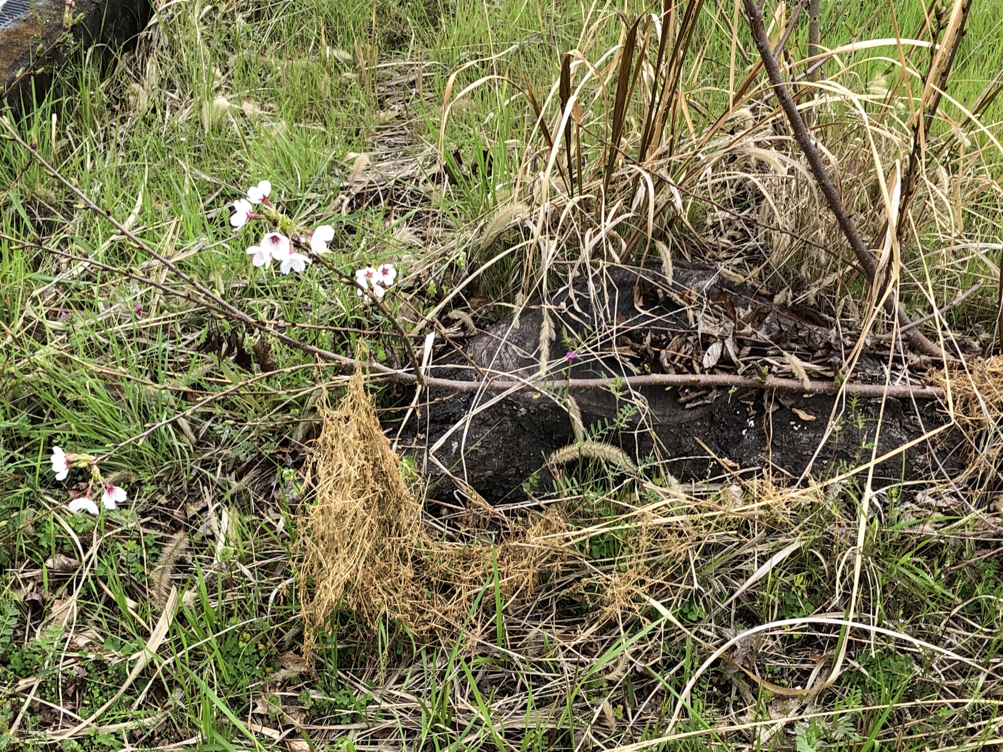 空き地の草むら、横になった枝に桜。