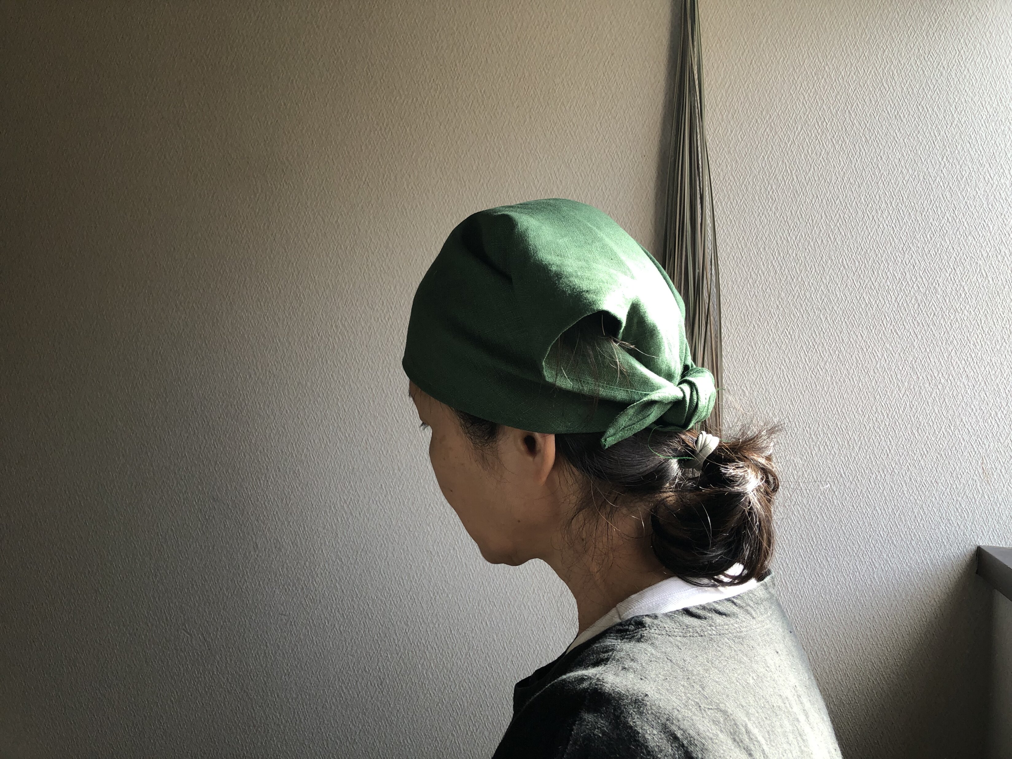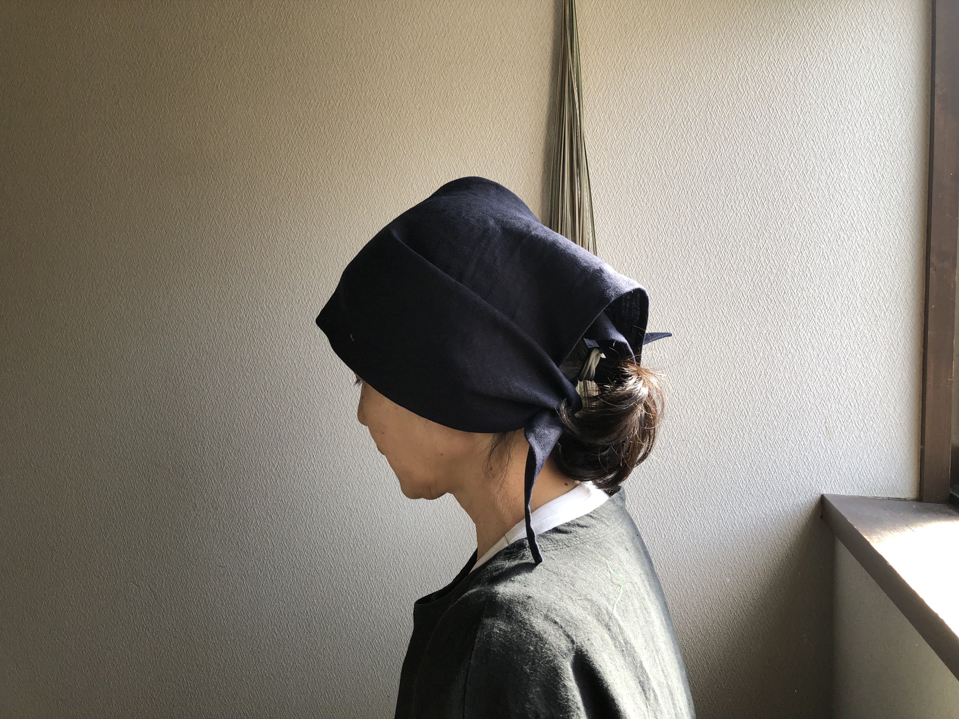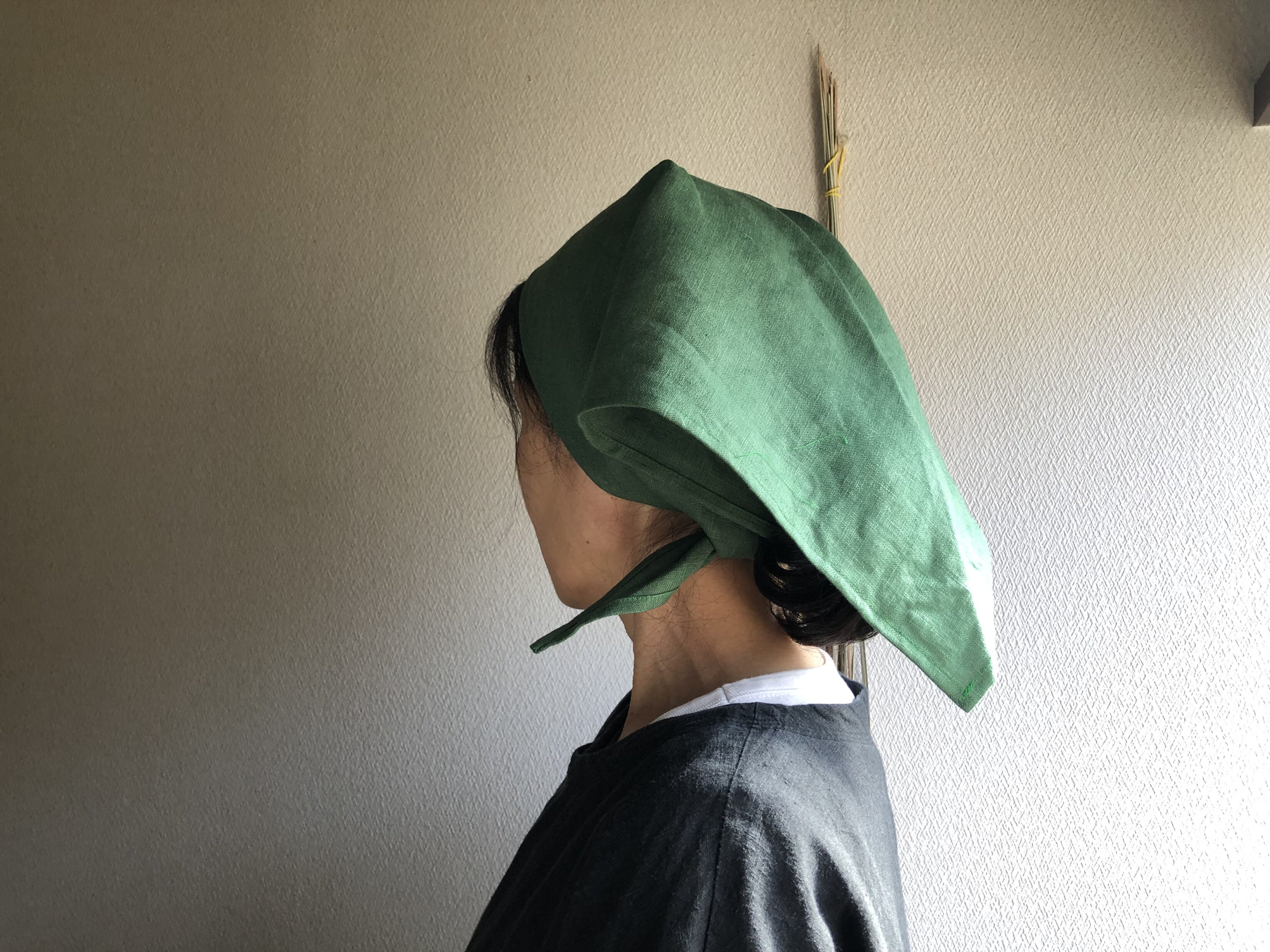 リネン三角巾¥1,210(税込) エプロン素材:リネン100%サイズ:1辺 62cmグリーンリネン三角巾 ¥1,210少し前髪を出して額くらいにして後ろの三角部分を巻き込むネィビーリネン三角巾 ¥1,210グレーリネン三角巾 ¥1,210お問い合わせ・ご注文