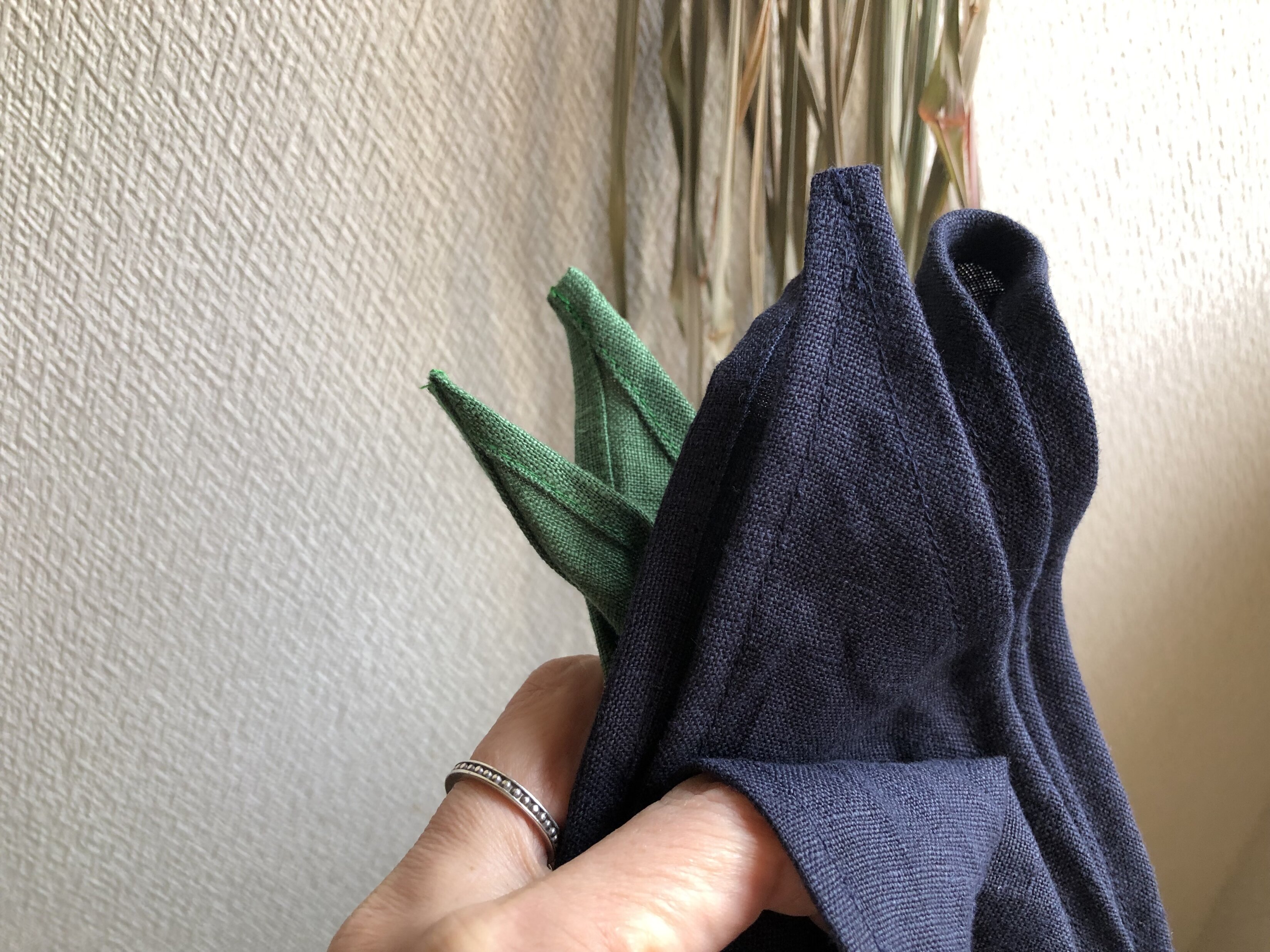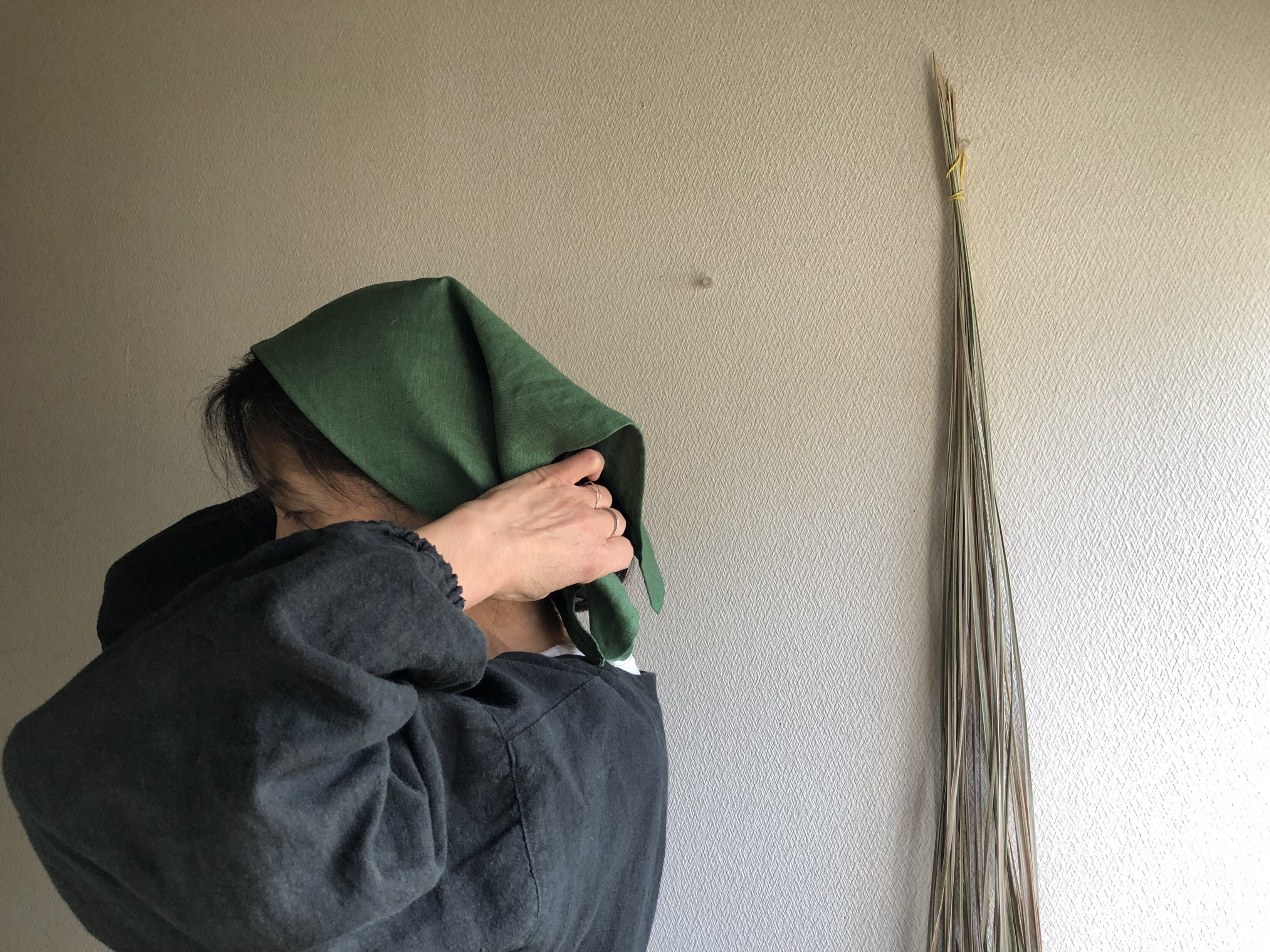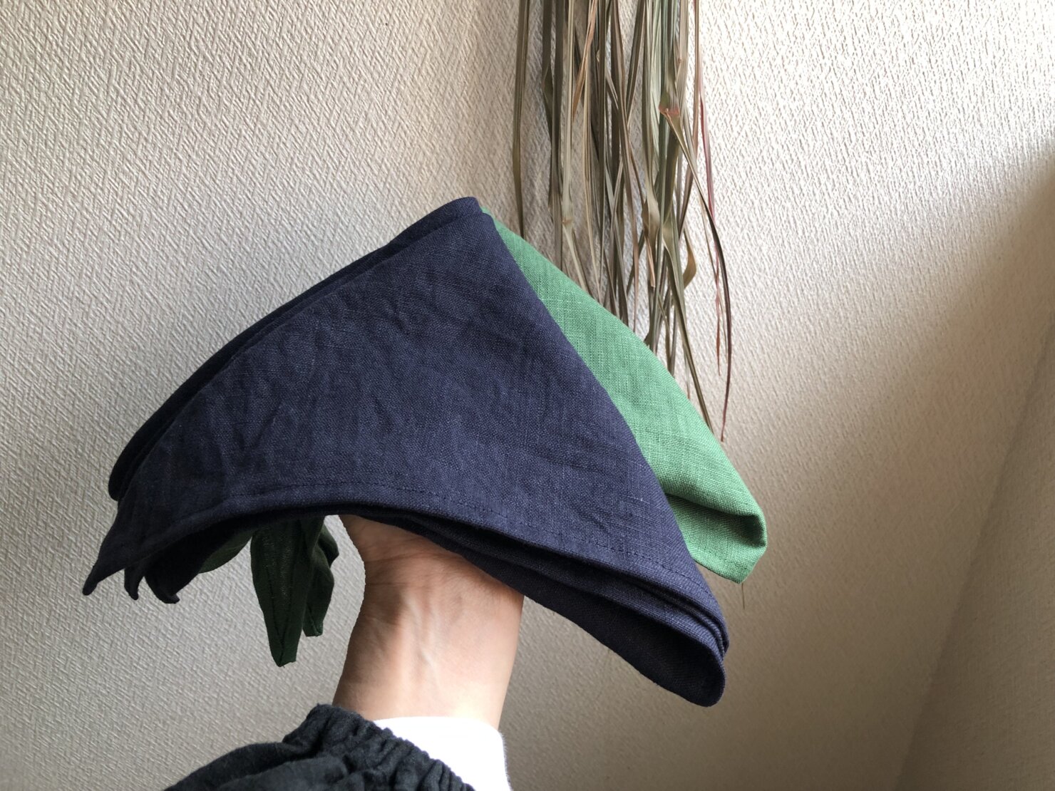 リネン三角巾¥1,210(税込) エプロン素材:リネン100%サイズ:1辺 62cmグリーンリネン三角巾 ¥1,210少し前髪を出して額くらいにして後ろの三角部分を巻き込むネィビーリネン三角巾 ¥1,210グレーリネン三角巾 ¥1,210お問い合わせ・ご注文